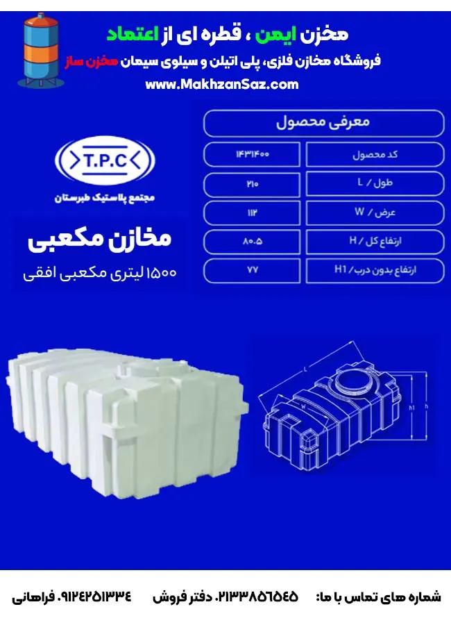 مخزن 1500 لیتری مکعبی افقی طبرستان، با طراحی افقی و ظرفیت بالا، برای ذخیره‌سازی حجم قابل‌توجهی از آب و مایعات ساخته شده است. این مخزن آب، با ساختار سه لایه و ویژگی ضد جلبک، گزینه‌ای عالی برای مصارف خانگی، صنعتی و کشاورزی به شمار می‌آید.